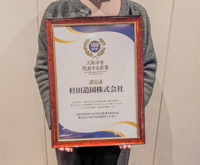 杉田造園株式会社が、地方創生メディア「Made In Local」の選定する「地域を代表する企業100選」にて、大阪市エリアの企業100選の認定を受けました。